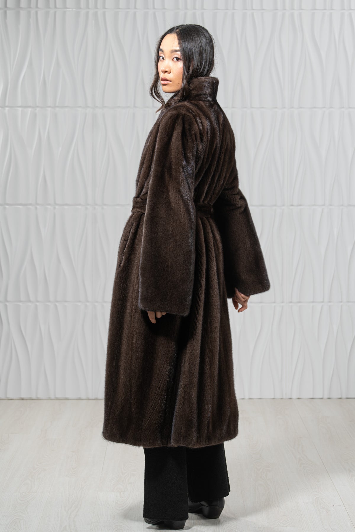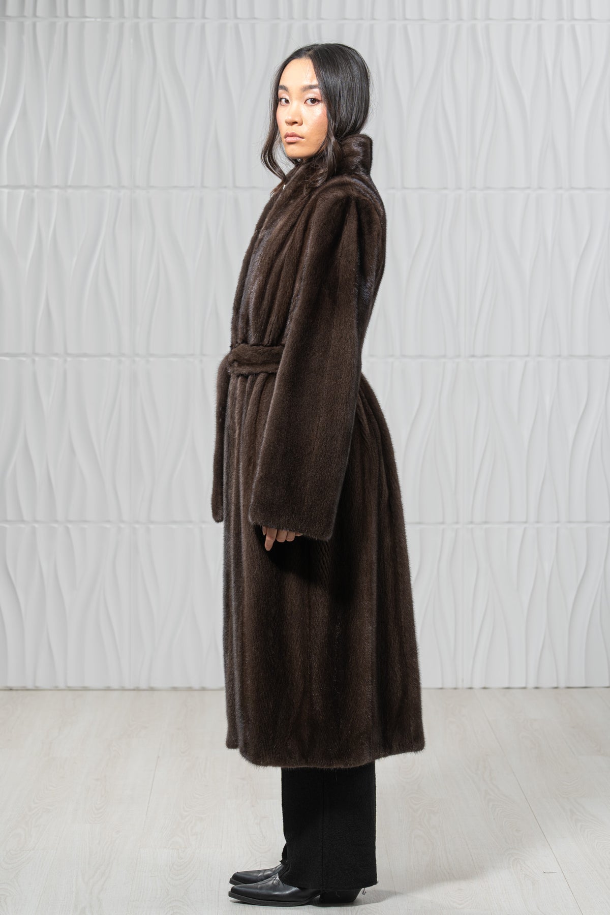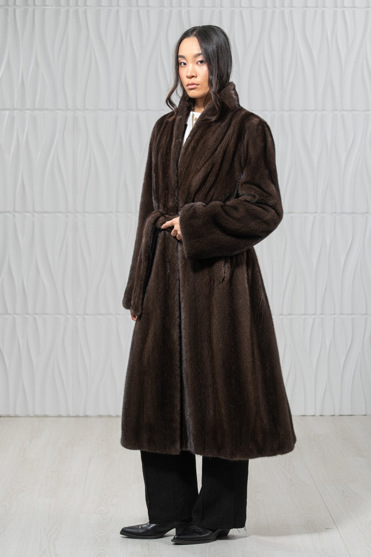 Designed for the modern woman who appreciates peerless quality, this full-length mink coat offers a luxurious drape and exceptional warmth, perfect for making a grand entrance or elevating your everyday winter attire. Each ethically sourced mink skin is carefully selected from the world's most reputable auctions, ensuring both exquisite quality and responsible practices, reflecting our commitment to sustainability and excellence.