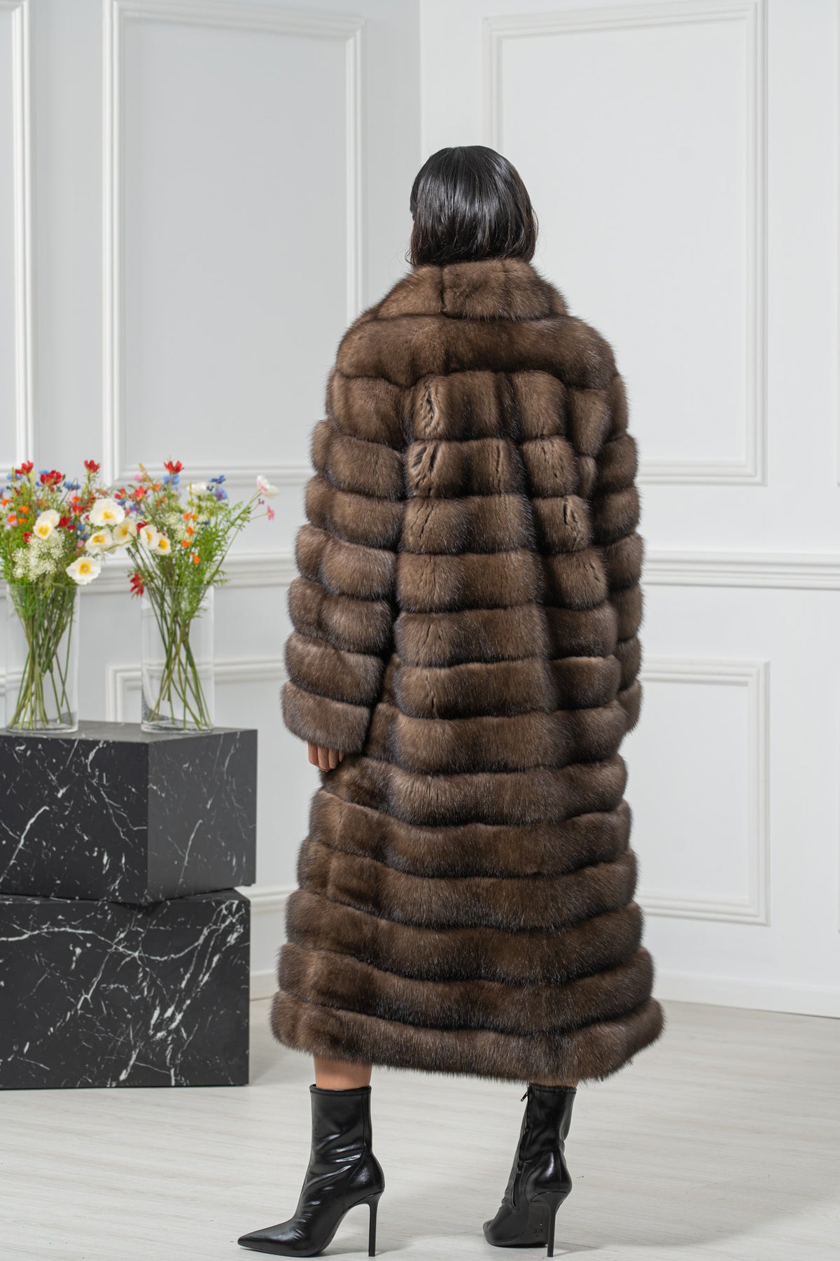 Indulge in unparalleled luxury and timeless elegance with our exquisite Russian Sable Platinum Skin Natural Long Hair Coat. This sumptuous women's fur coat is a true masterpiece, meticulously crafted to elevate your winter wardrobe with supreme sophistication, warmth, and prestige.