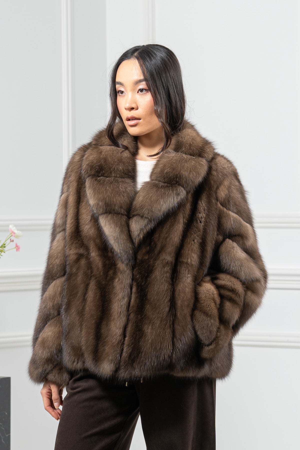The chic, short silhouette of this women's sable coat provides a modern and elegant design that effortlessly complements both sophisticated daytime attire and glamorous evening wear. Our commitment to ethical sourcing ensures that each premium Russian Sable skin is acquired from the most renowned international auctions, guaranteeing exceptional quality, responsible practices, and sustainability.