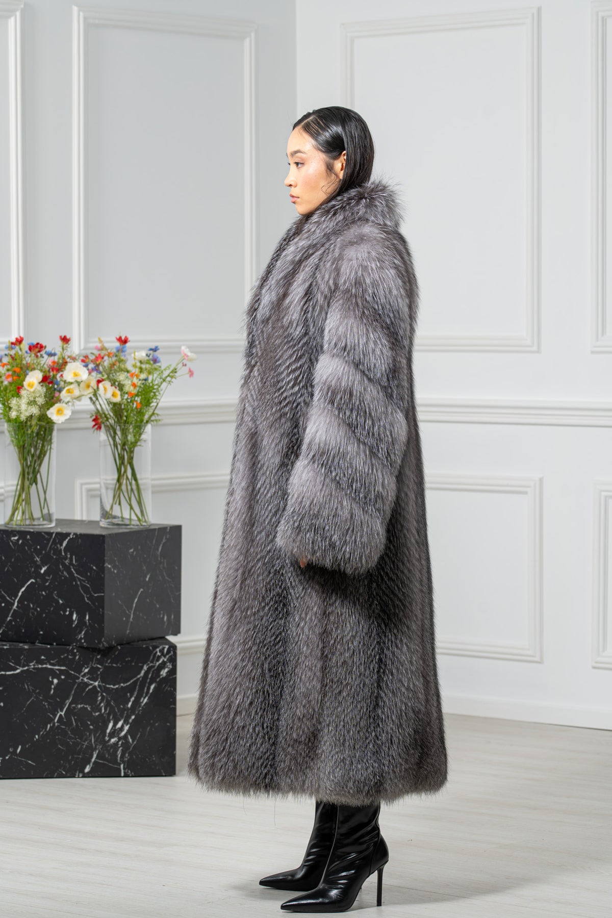 Handcrafted in Kastoria, Greece, a region celebrated for its generations of fur artistry, this stunning coat showcases the breathtaking beauty and silky texture of authentic **natural Blue Frost Fox fur**. The unique 'Blue Frost' hue, characterized by its natural silver-blue tones with darker guard hairs, creates a luxurious and striking visual appeal. Its voluminous, long hair provides exceptional warmth and a dramatic, elegant silhouette that turns heads, making it a truly timeless and eye-catching statement piece.